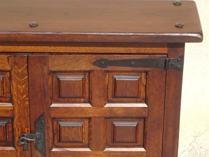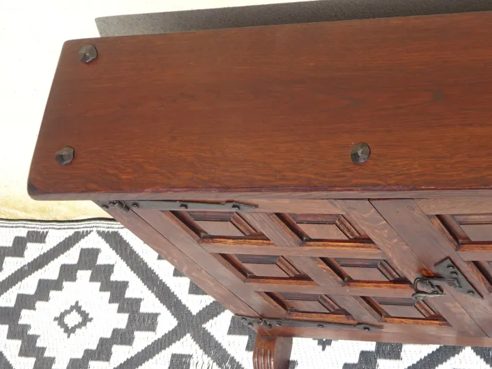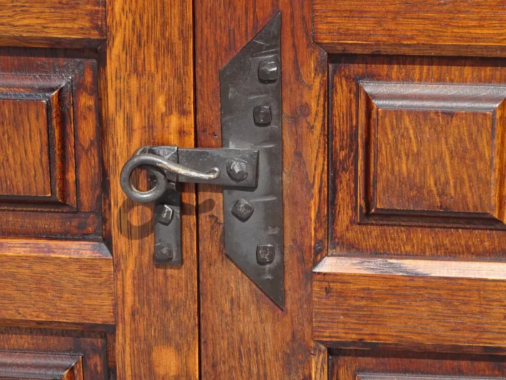Two opening doors, made of solid wood, paneled. Closing system: a large black iron tilting latch matching the wide mounting hardware.