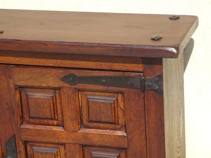 3 cm thick oak top, rounded edges, large mounting nails, and visible black iron head.