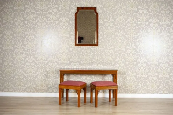 Dimensions in cm (H/W/D): table 71 x 130 x 39; stools 49 x 49 x 37; Mirror 93 x 56 x 2.