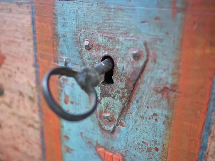 At the center lies the original wrought iron lock, underlining both function and authenticity.