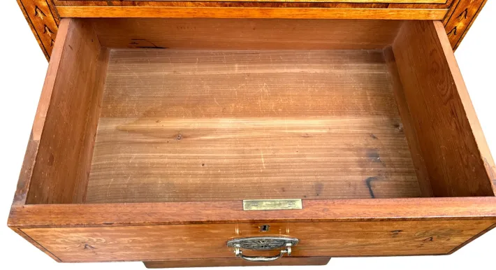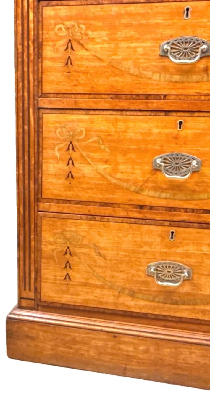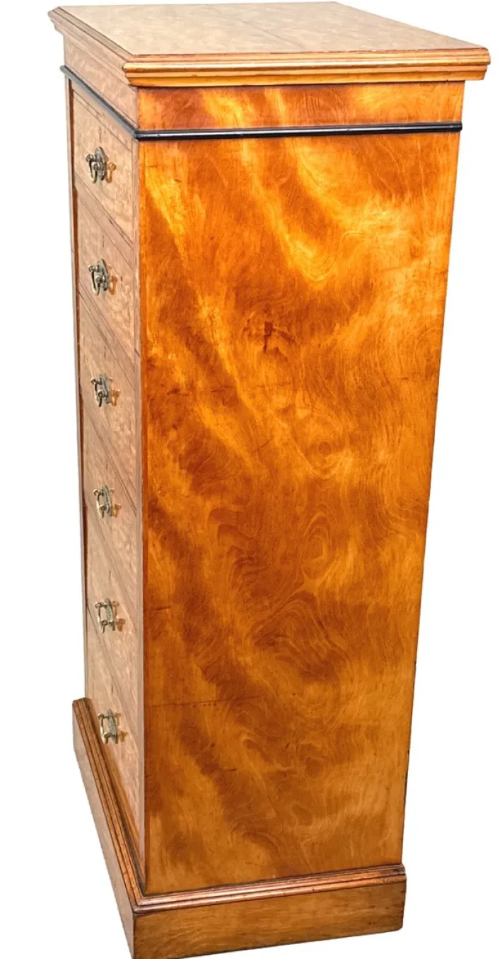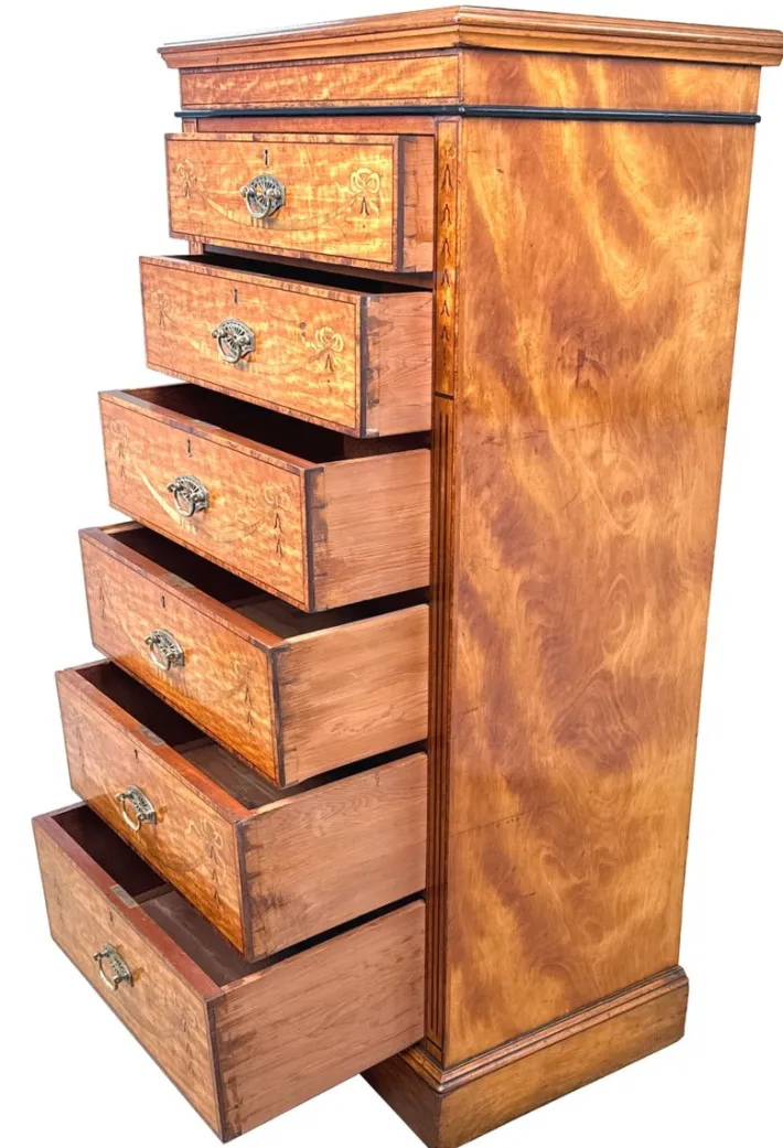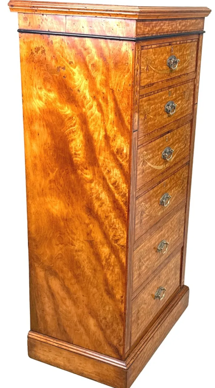 A stunning quality late 19th century victorian satinwood chest of drawers which is very similar in proportions to the ever popular wellington chest, although it doesn’t have the hinged pilaster with single lock like a wellington chest. Instead with this particular design you get six superbly smooth, functional drawers with their own locks.