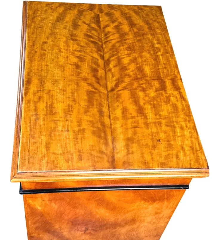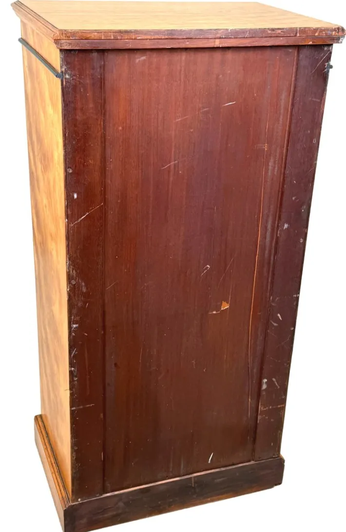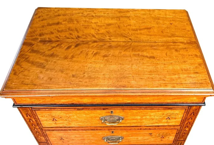 It is constructed using high end secondary timbers like mahogany and cedar wood and the satinwood veneers are of the highest grade. They are about the best satinwood veneers which we have seen on an item of furniture as late in date as this boasting lovely figuring and a great colour.