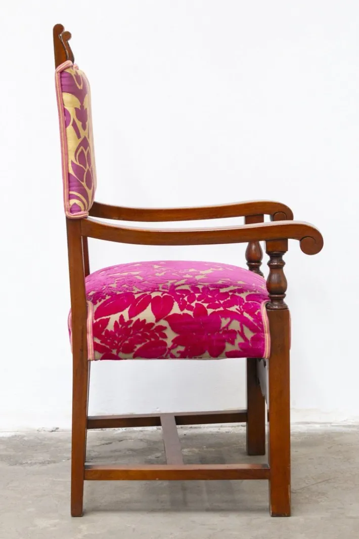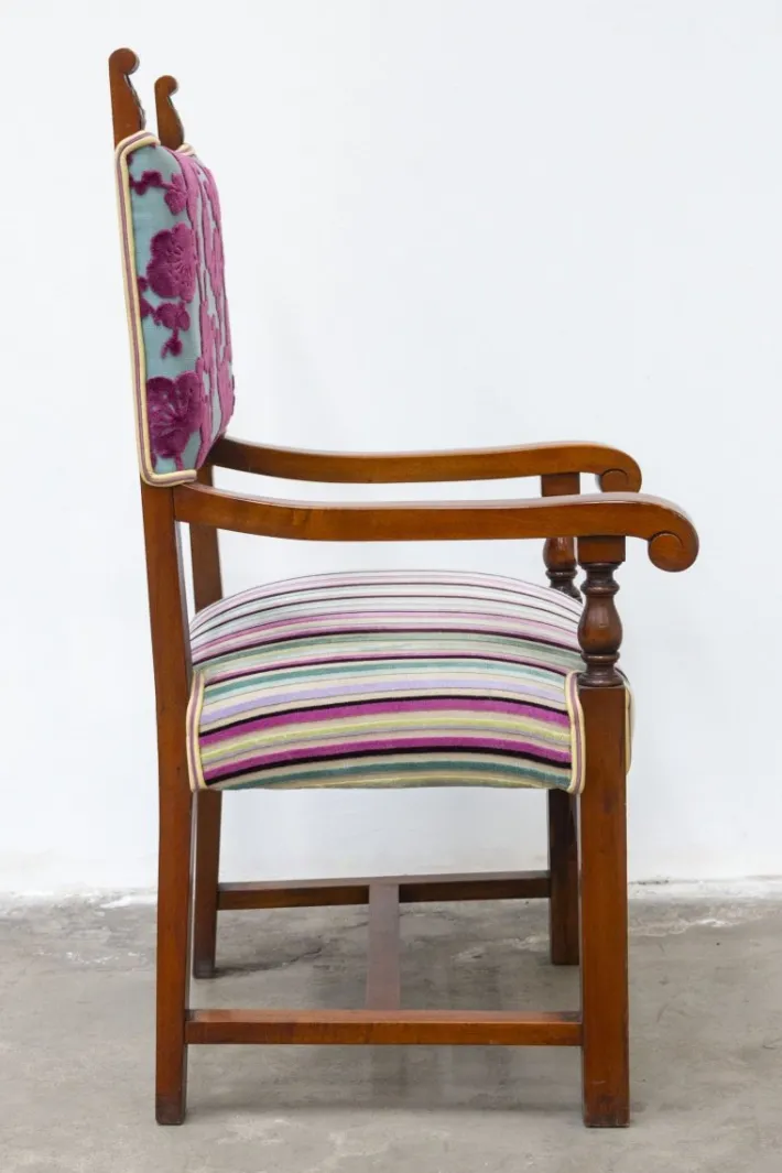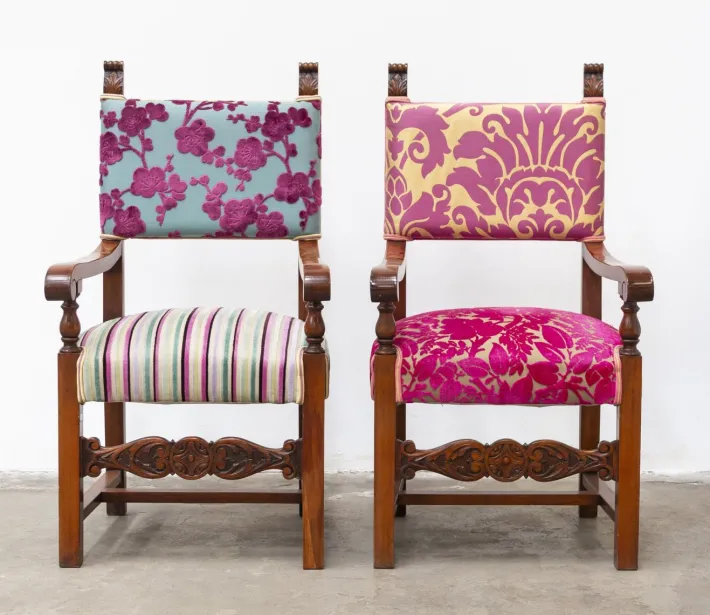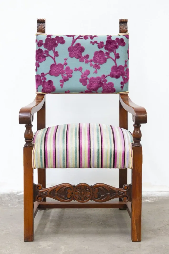 They have recently been reupholstered with fine fabrics in fabric and velvet with striped and floral motifs.