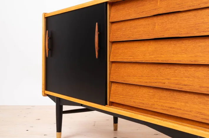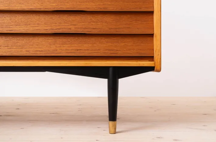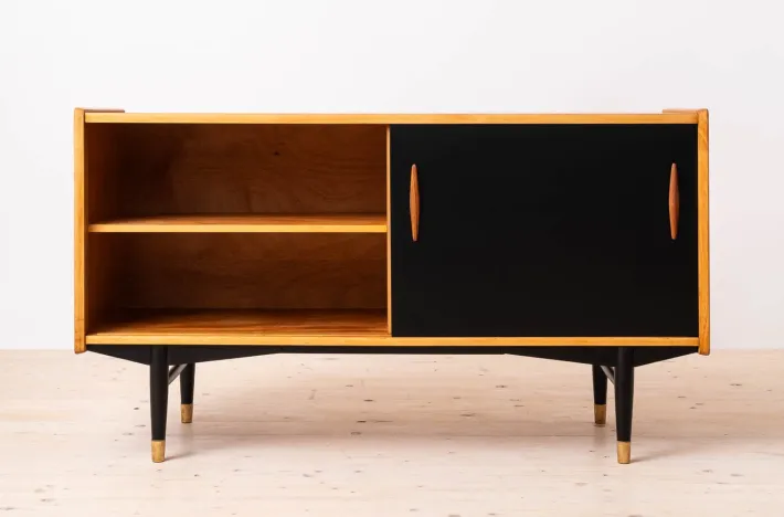 Originally designed most probably for the esteemed Hugo Troeds Mobelfabrik. The easily sliding doors reveal a well-organized interior, boasting a shelf on the left and a section with five drawers on the right, providing ample storage space.
