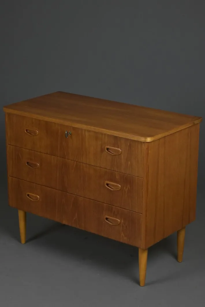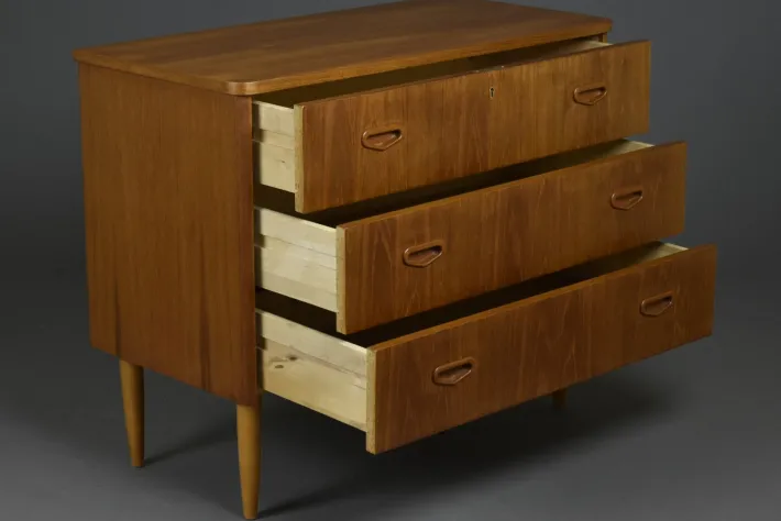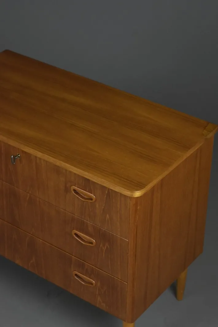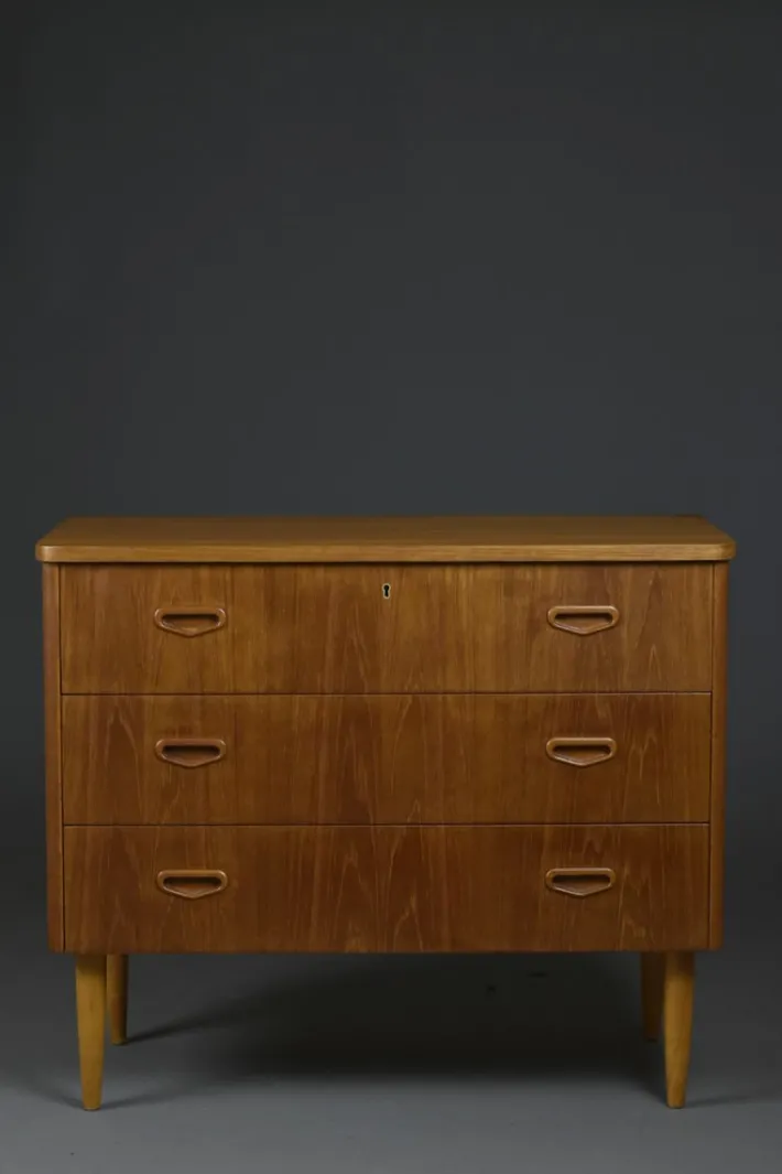 The surface has been carefully refreshed in our workshop and finished with a hardwax oil, which enhances the natural depth of the teak grain and ensures durable protection. The minimalist form, warm tone of the wood, and practical storage capacity make this chest a versatile addition to both vintage-inspired and contemporary interiors.