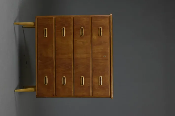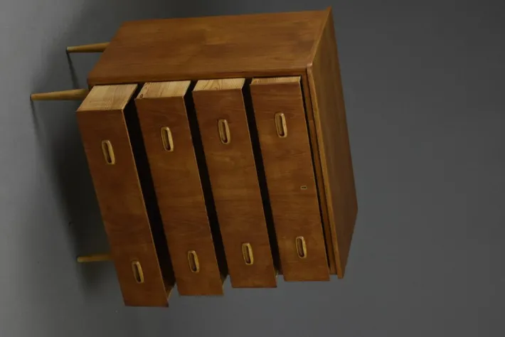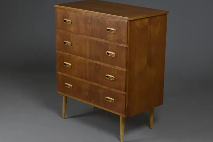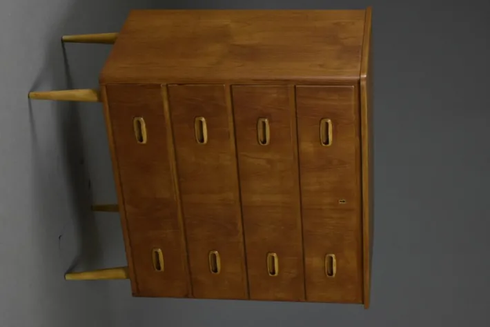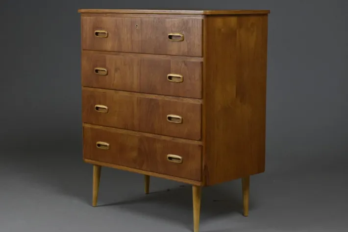 The surface has been carefully refreshed in our workshop and finished with a hardwax oil, enhancing the warm tones of the teak veneer and ensuring durable protection. Its compact yet generous proportions make it an ideal solution for both living and bedroom interiors.
