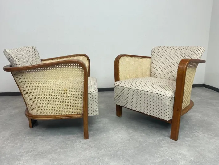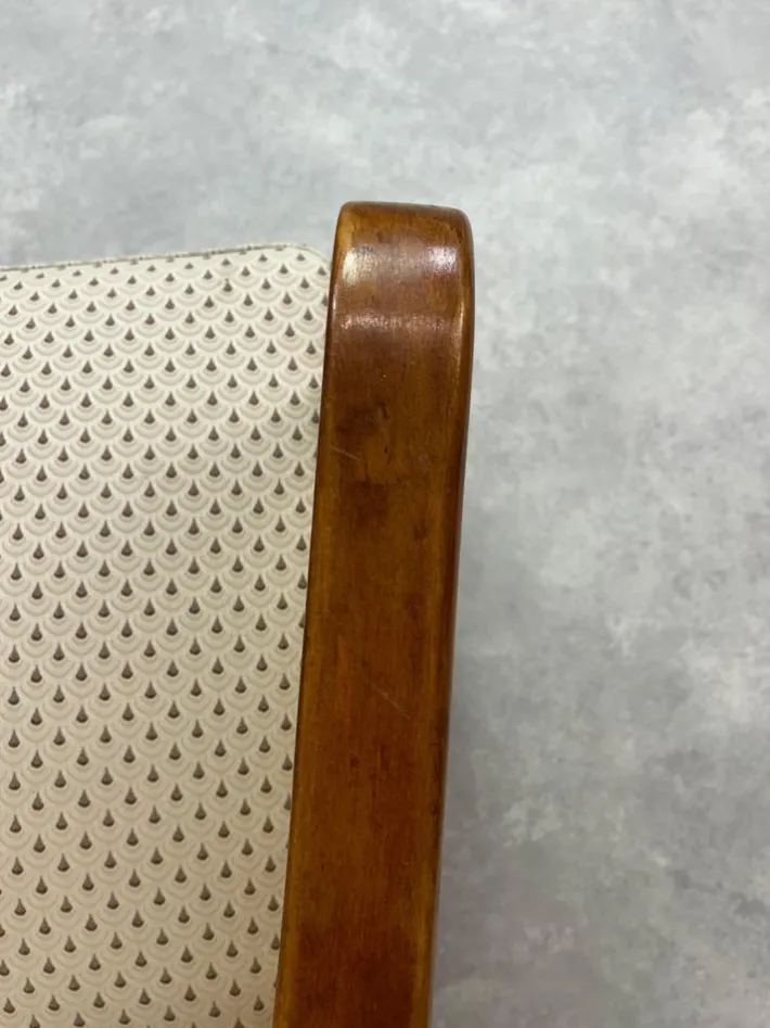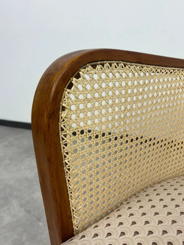 | Restoration and Damage Details | Refinished. Repaired: new hand made rattan. Reupholstered. |