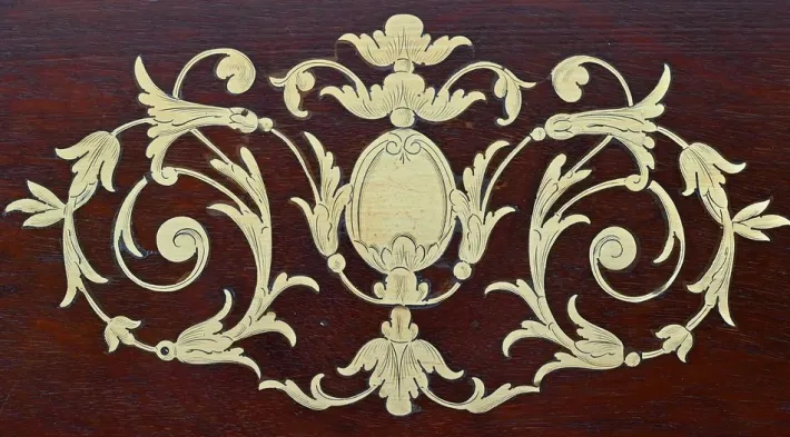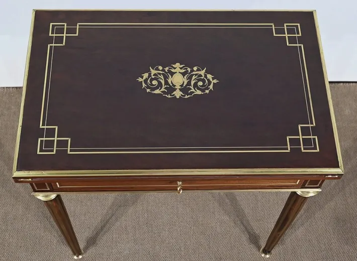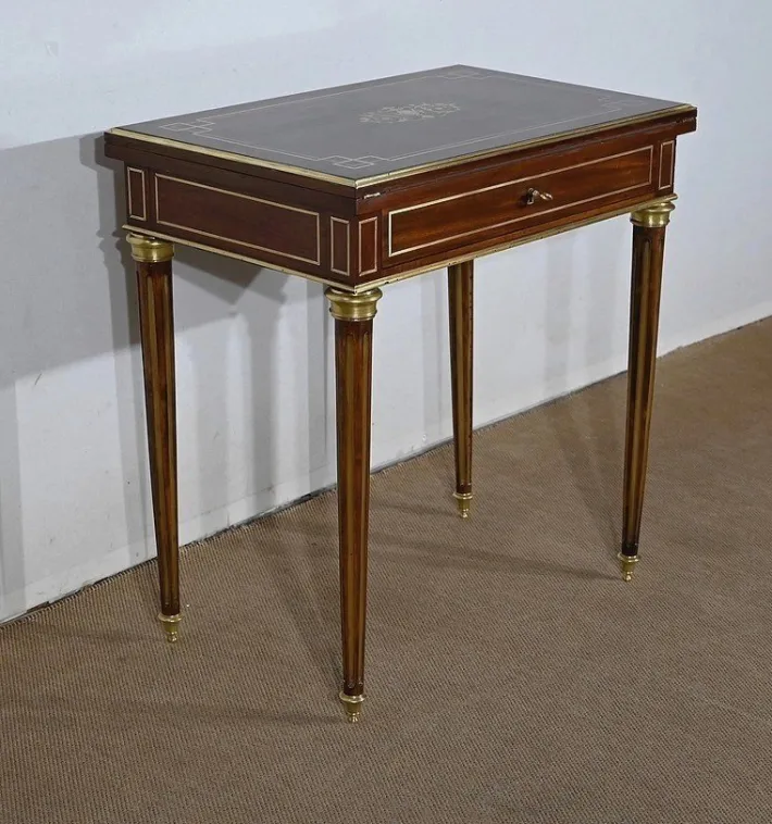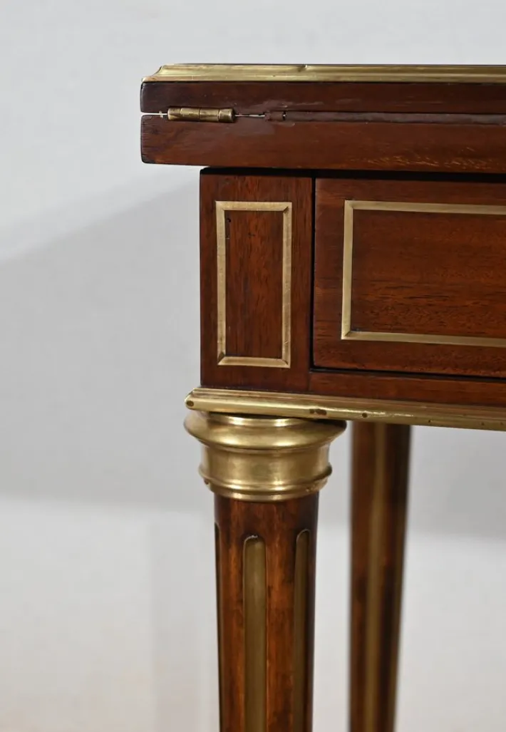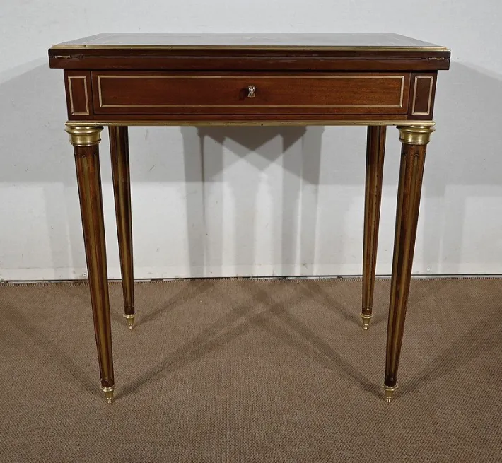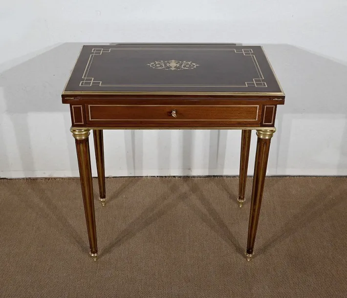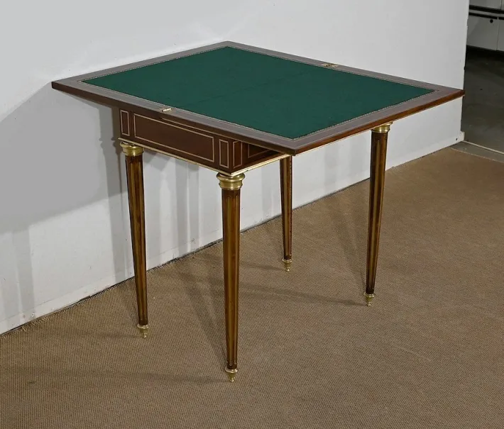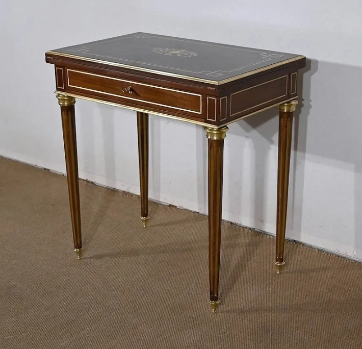 Finally, this table opens onto a game tray with mahogany frame with a tab cut with a green felt. Its belt is embellished with brass nets and underlined with a wand around.