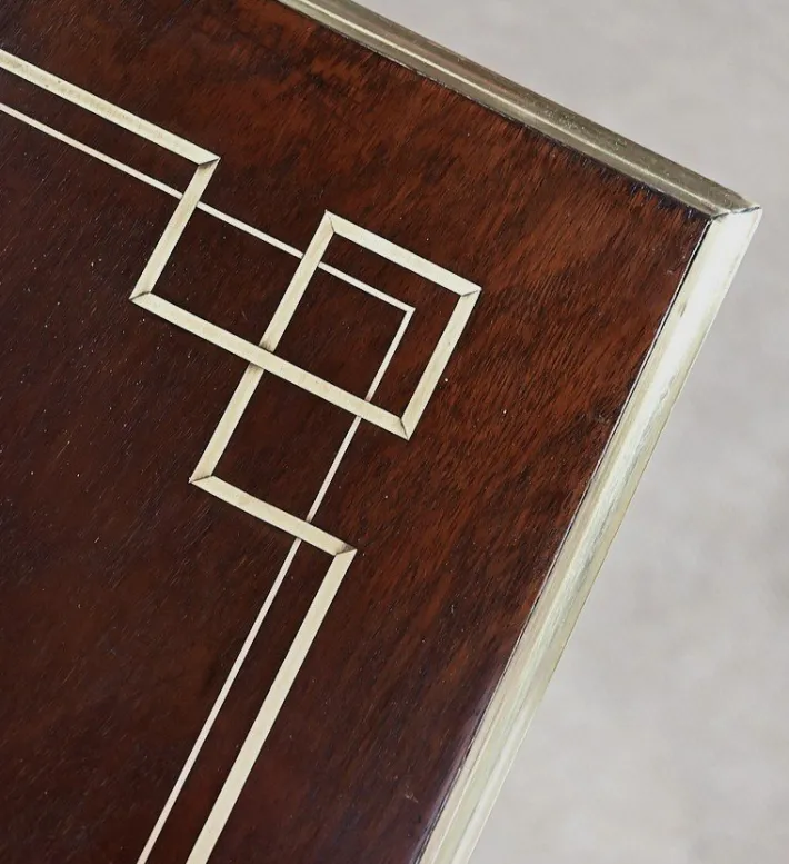 The rectangular top is embellished with a molded brass baguette around, a mahogany veneer with brass net with Greek angles and an encrusted pattern. This central chiseling is made up of arabesques and foliage surrounding a medallion.