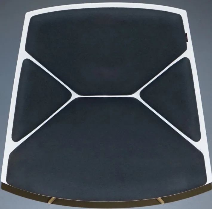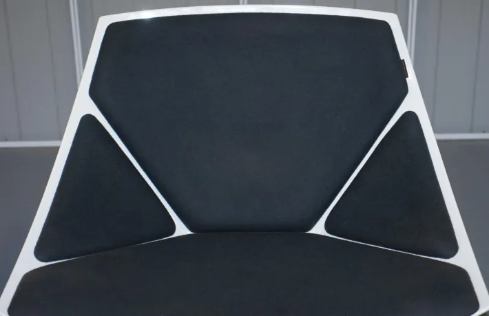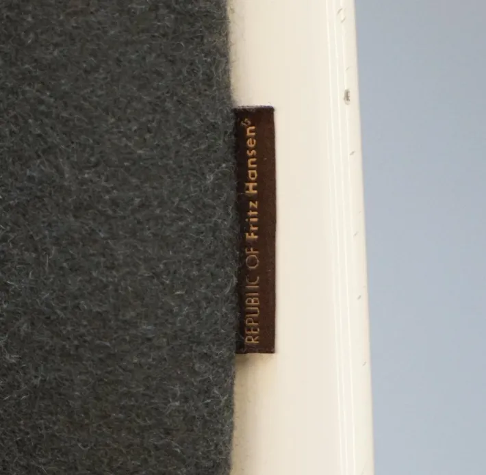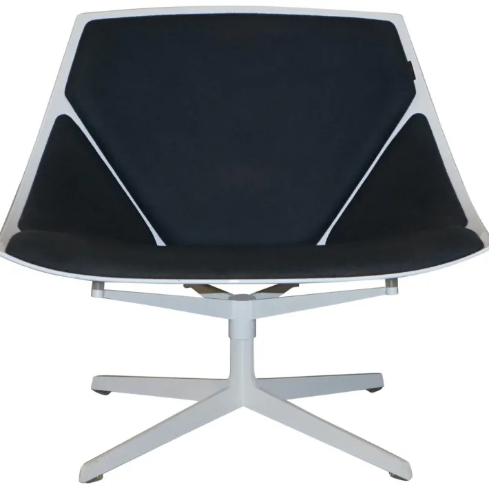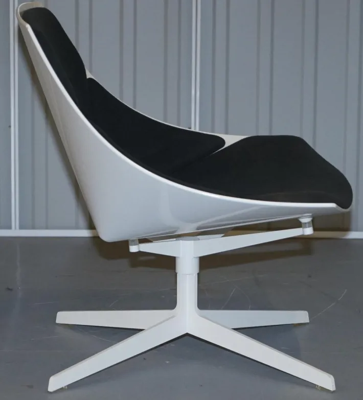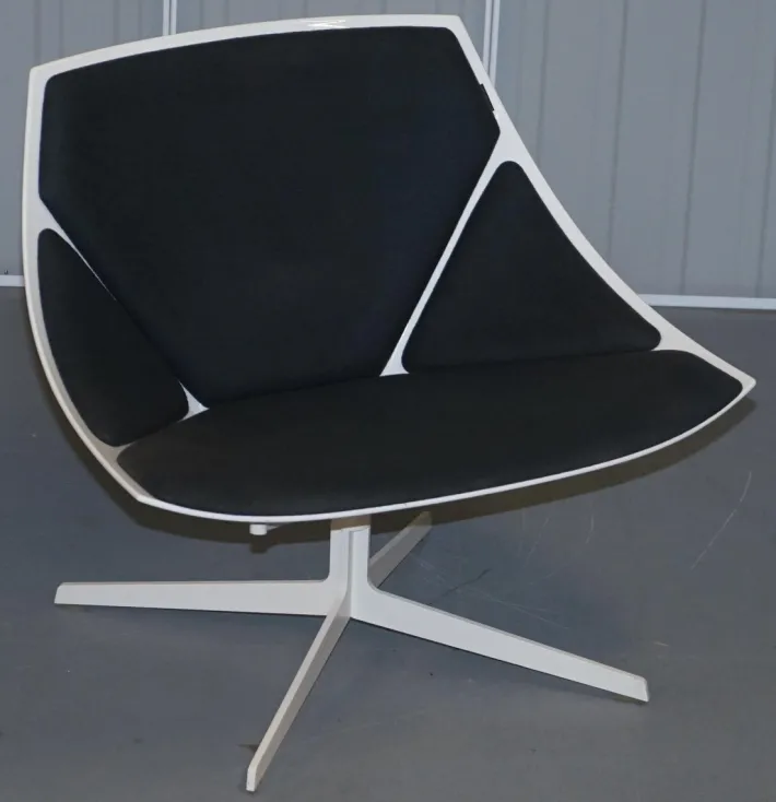 The space lounge chair was designed by the German design duo Jehs+Laub for Fritz Hansen in 2007. Featuring a combination straight-edged, geometric aesthetics and smooth curves, the Space Lounge Chair from Fritz Hansen is an ultra-modern and highly comfortable chair designed on the idea of sitting in a hand. Shell made from injection-moulded fibre-reinforced plastic with front upholstery Base made from lacquered steel matching the shell