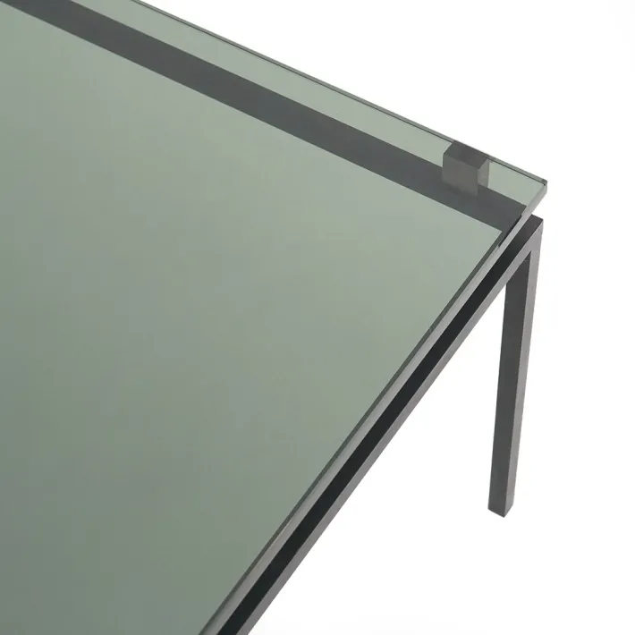The structure, made of black lacquered metal with nickel-plated brass details, supports an elegant smoked glass top, a hallmark of the period’s design. with its clean lines and understated elegance, this table is a versatile piece, suitable for both modern and classic interiors.