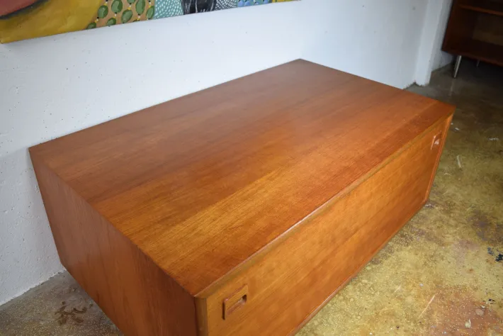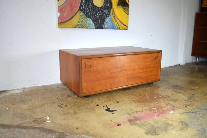 The lowboard features a well-preserved teak veneer and a large, smooth-running drawer. The drawer is lined with felt on the inside. There are small black feet under the cabinet. The veneer has been re-oiled; minor scratches are present.