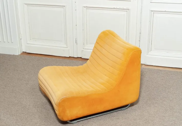 The chair’s flowing lines and low, sculptural form reflect the futuristic aesthetics of the era, while the vibrant orange upholstery adds a bold, playful character typical of 1970s interiors. Horizontal stitched channels accentuate its curves and emphasize the dynamic, wave-like shape.