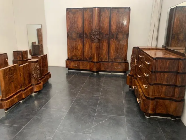 The chest of drawers in walnut wavy lines has 4 drawers with a door to the side.