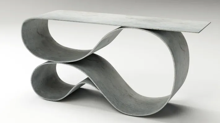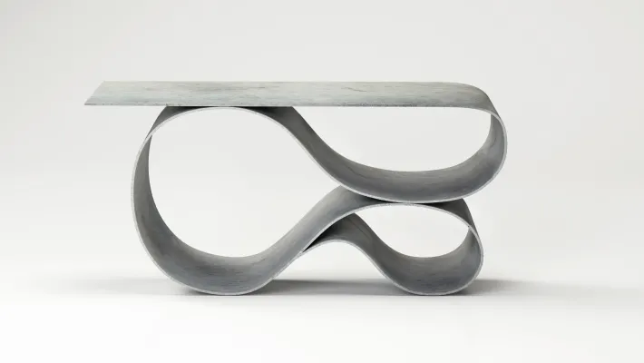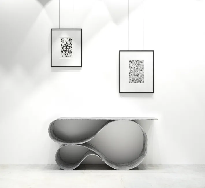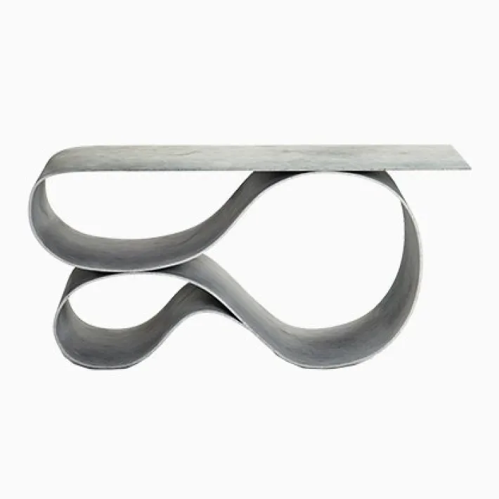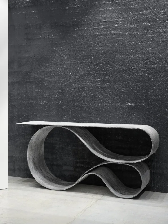 The innovative console table is made of Concrete Canvas, a patented concrete-impregnated fabric not commonly used in furniture design.
